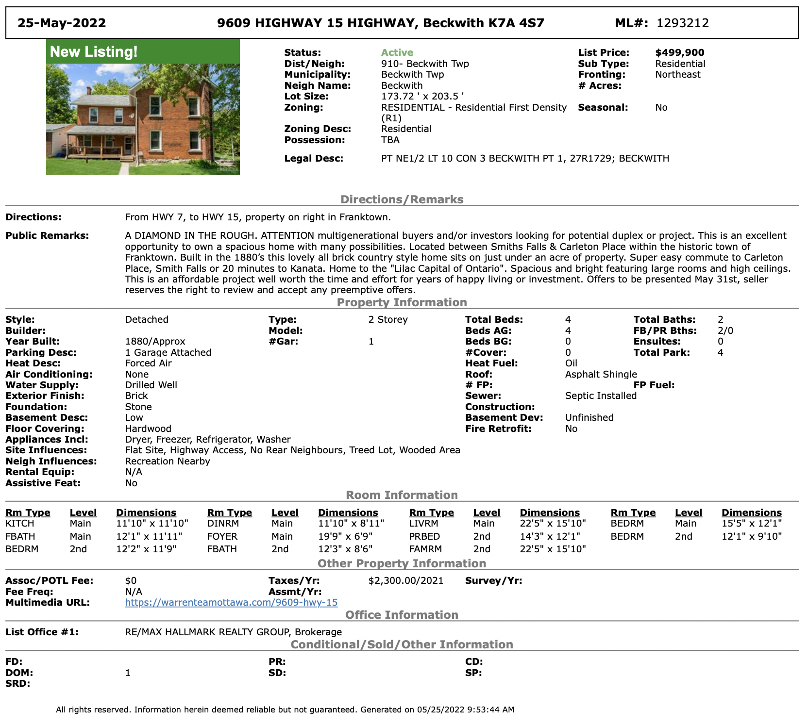 Attention multigenerational buyers and/or investors looking for potential duplex or project. This is an excellent opportunity to own a spacious home with many possibilities. Located between Smiths Falls & Carleton Place within the historic town of Franktown. Built in the 1880’s this lovely all brick country style home sits on just under an acre of property. Super easy commute to Carleton Place, Smith Falls or 20 minutes to Kanata. Home to the "Lilac Capital of Ontario". Spacious and bright featuring large rooms and high ceilings. This is an affordable project well worth the time and effort for years of happy living or investment. Offers to be presented May 31st, seller reserves the right to review and accept any preemptive offers.