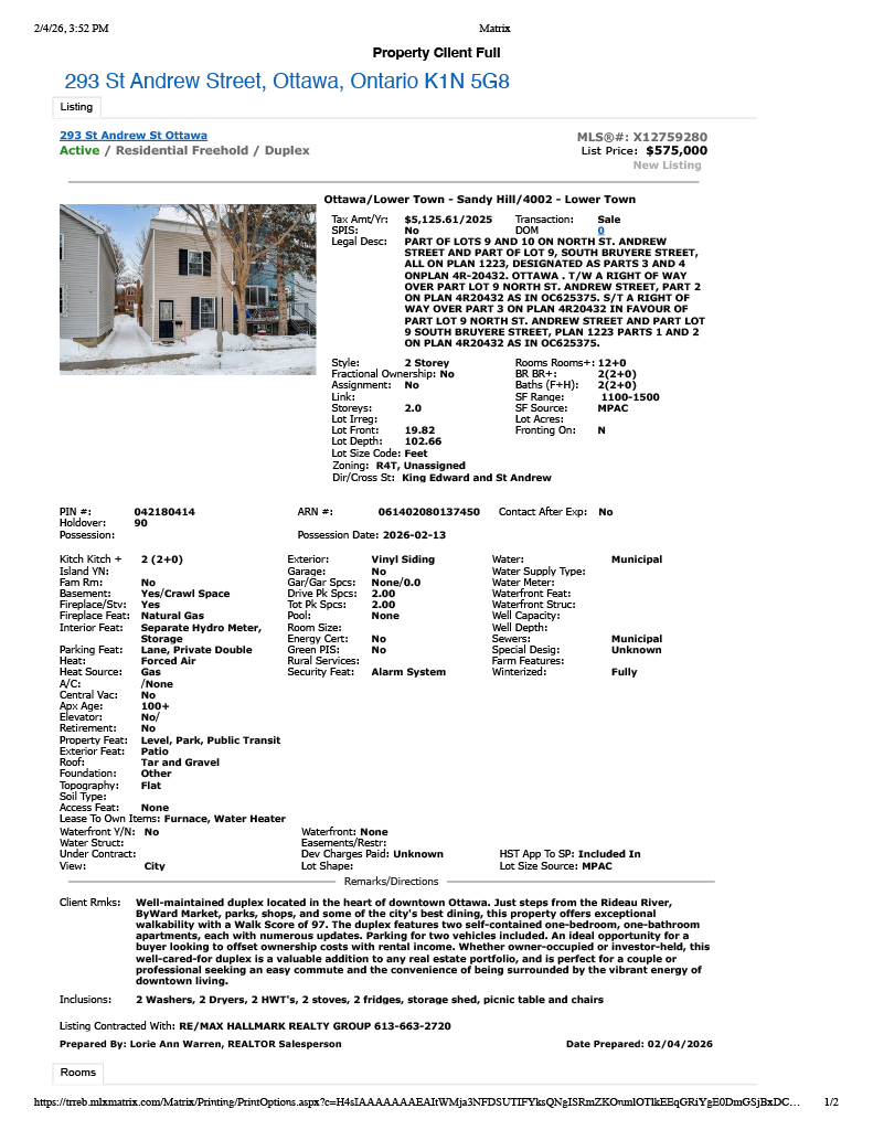 Just steps from the Rideau River, ByWard Market, parks, shops, and some of the city's best dining, this property offers exceptional walkability with a Walk Score of 97. The duplex features two self-contained one-bedroom, one-bathroom apartments, each with numerous updates. Parking for two vehicles is included. An ideal opportunity for a buyer looking to offset ownership costs with rental income. Whether owner-occupied or investor-held, this well-cared-for duplex is a valuable addition to any real estate portfolio, and is perfect for a couple or professional seeking an easy commute and the convenience of being surrounded by the vibrant energy of downtown living.