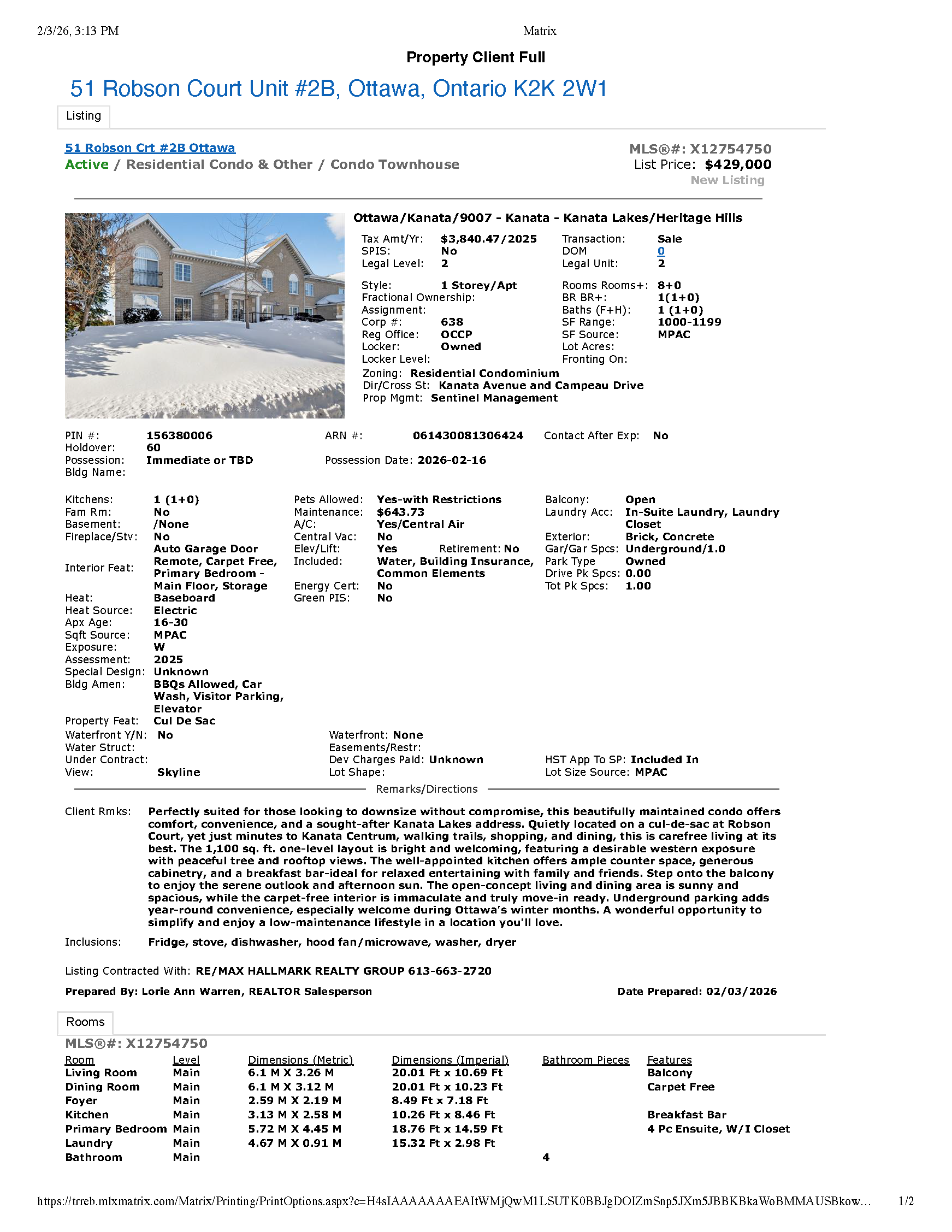 This beautifully maintained condo offers comfort, convenience, and a sought-after Kanata Lakes address. Quietly located on a cul-de-sac at Robson Court, yet just minutes to Kanata Centrum, walking trails, shopping, and dining, this is carefree living at its best. The 1,100 sq. ft. one-level layout is bright and welcoming, featuring a desirable western exposure with peaceful tree and rooftop views. The well-appointed kitchen offers ample counter space, generous cabinetry, and a breakfast bar-ideal for relaxed entertaining with family and friends. Step onto the balcony to enjoy the serene outlook and afternoon sun. The open-concept living and dining area is sunny and spacious, while the carpet-free interior is immaculate and truly move-in ready. Underground parking adds year-round convenience, especially welcome during Ottawa's winter months. A wonderful opportunity to simplify and enjoy a low-maintenance lifestyle in a location you'll love.