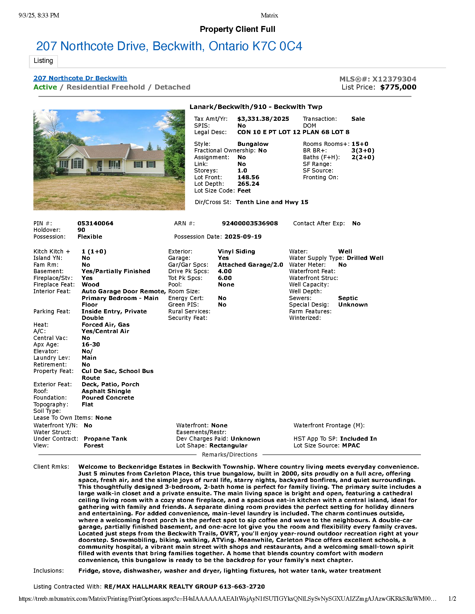 Just 5 minutes from Carleton Place, this true bungalow, built in 2000, sits proudly on a full acre, offering space, fresh air, and the simple joys of rural life, starry nights, backyard bonfires, and quiet surroundings. This thoughtfully designed 3-bedroom, 2-bath home is perfect for family living. The primary suite includes a large walk-in closet and a private ensuite. The main living space is bright and open, featuring a cathedral ceiling living room with a cozy stone fireplace, and a spacious eat-in kitchen with a central island, ideal for gathering with family and friends. A separate dining room provides the perfect setting for holiday dinners and entertaining. For added convenience, main-level laundry is included. The charm continues outside, where a welcoming front porch is the perfect spot to sip coffee and wave to the neighbours. A double-car garage, partially finished basement, and one-acre lot give you the room and flexibility every family craves. Located just steps from the Beckwith Trails, OVRT, you'll enjoy year-round outdoor recreation right at your doorstep. Snowmobiling, biking, walking, ATVing. Meanwhile, Carleton Place offers excellent schools, a community hospital, a vibrant main street with shops and restaurants, and a welcoming small-town spirit filled with events that bring families together. A home that blends country comfort with modern convenience, this bungalow is ready to be the backdrop for your family's next chapter.